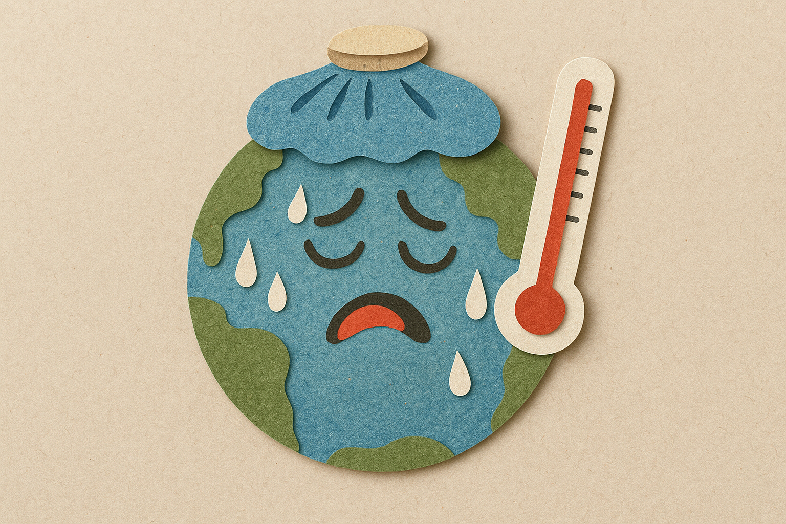 Ilustración del planeta Tierra con expresión triste, gotas de sudor y un termómetro alto, representando el calentamiento global y los efectos del cambio climático.